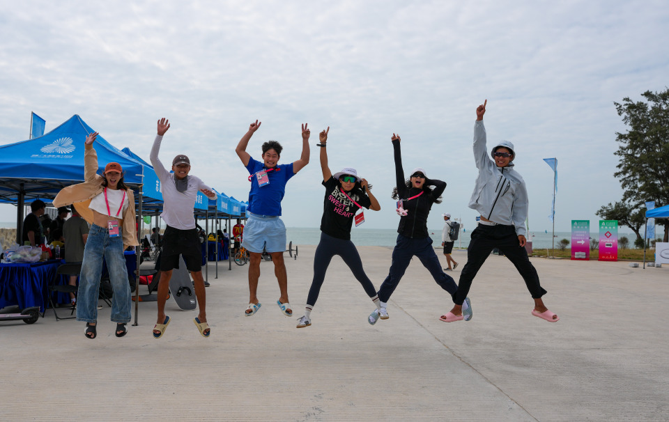 图为2025年10月26日,在广东省汕尾市举行的第十五届全运会帆船项目第二阶段比赛中,阿于五牛(右三)和队友在比赛准备阶段合影。新华社记者 晋美多吉 摄