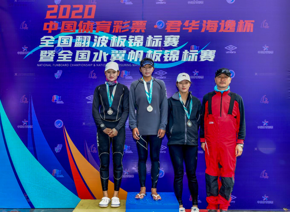 图为2020年12月,阿于五牛(左二)在海南举行的全国翻波板锦标赛暨全国水翼帆板锦标赛中夺冠。新华社发