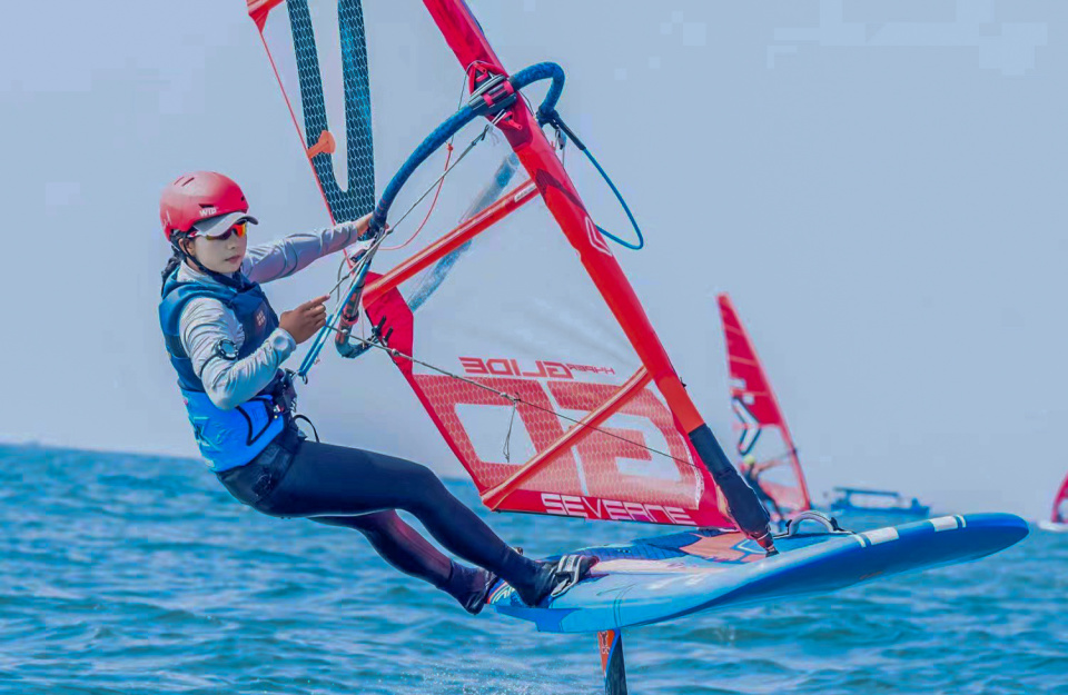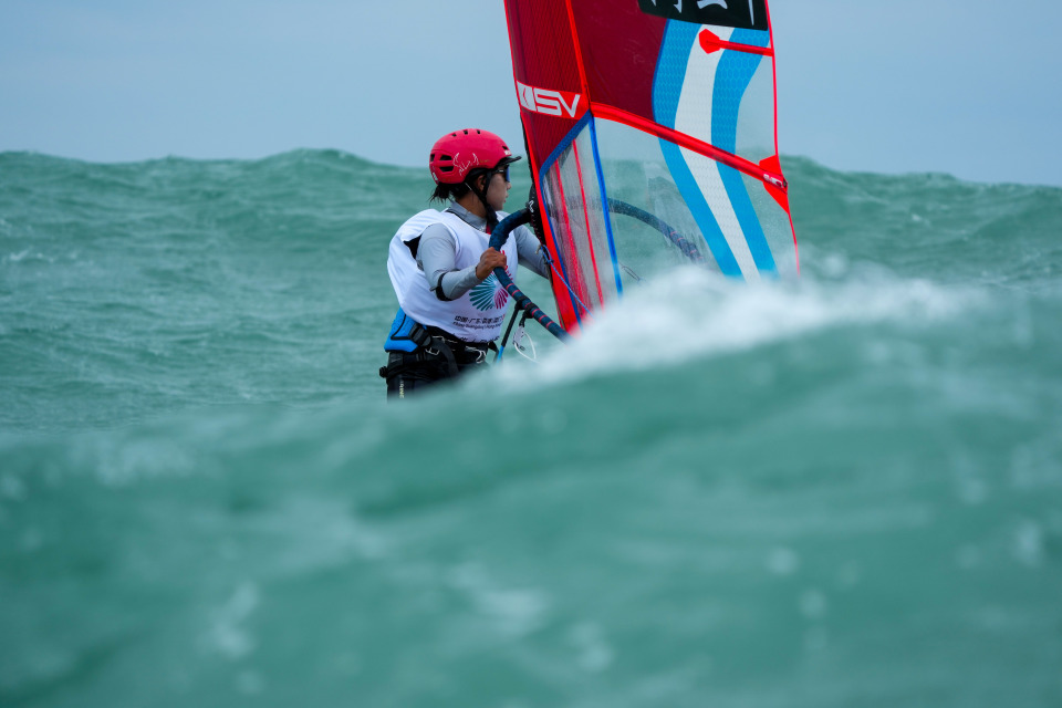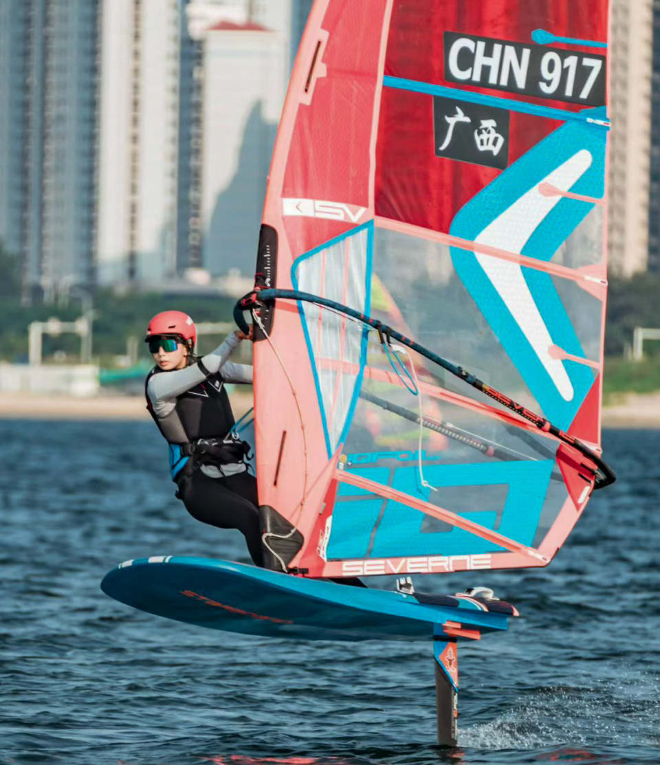图为2025年10月20日,阿于五牛在第十五届全运会帆船项目第一阶段女子水翼帆板比赛中。新华社记者 晋美多吉 摄
