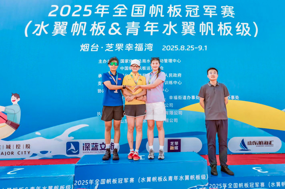 图为2025年8月,阿于五牛(左一)在山东烟台举行的全国帆板冠军赛中获得亚军。新华社发