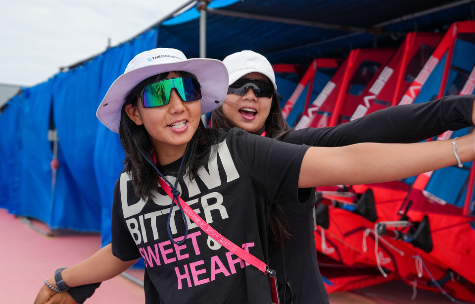 图为2025年10月26日,在广东省汕尾市举行的第十五届全运会帆船项目第二阶段比赛中,阿于五牛(左)和队友在比赛间隙。新华社记者 晋美多吉 摄