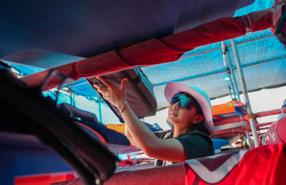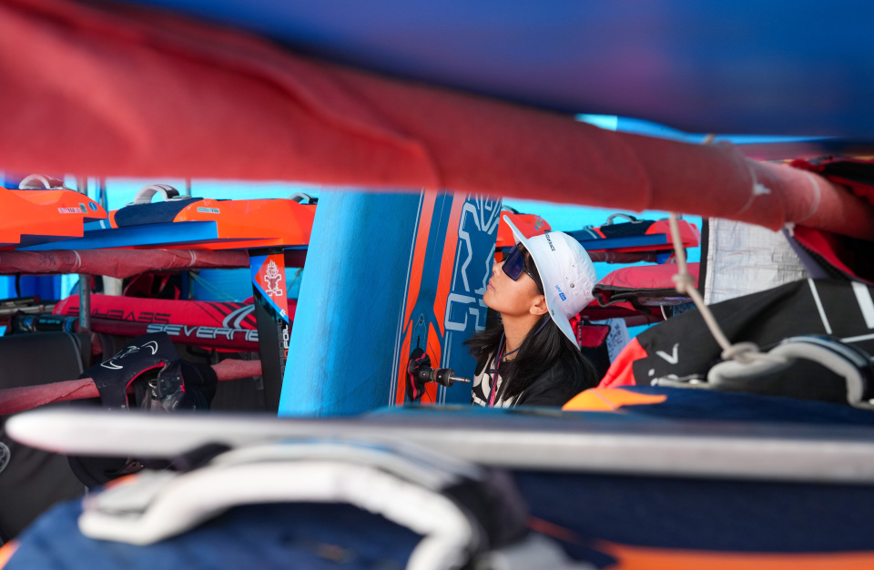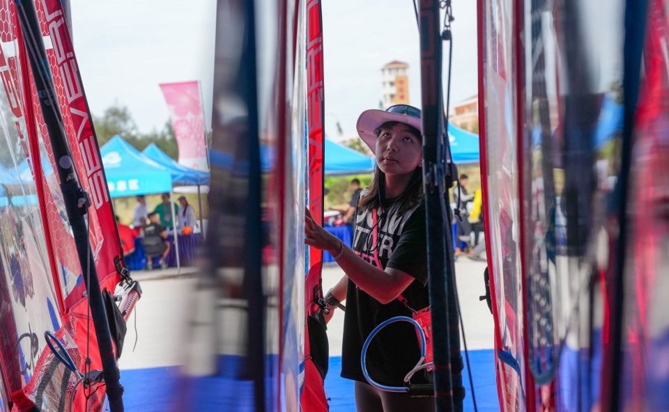 图为2025年10月26日,在广东省汕尾市举行的第十五届全运会帆船项目第二阶段比赛前,阿于五牛拿出自己的比赛装备,准备进行保养。新华社记者 晋美多吉 摄