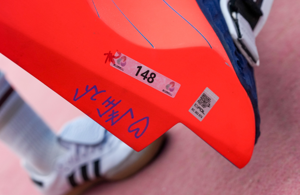 这是阿于五牛写在自己帆板上的彝文名字(2025年10月26日摄)。新华社记者 晋美多吉 摄
